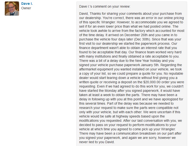 Then on January 18th, we get a call from Mark Greene at Lynch Mukwonago informing us they do not feel comfortable modifying a Jeep and we can come pick it up anytime.