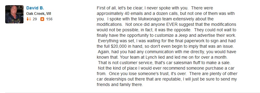 On Dec. 12th, 2017 I contacted Lynch Mukwonago Jeep about a Jeep they had listed on their website.